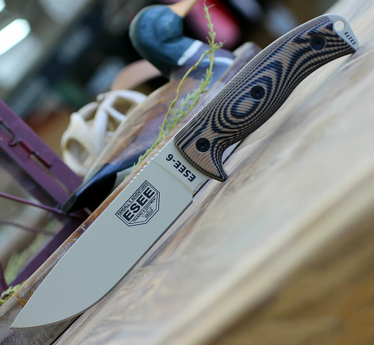ESEE-6 6PDT-005, 5.75″ 1095 Carbon Steel DT Plain Blade, Coyote/Black G10 3D Handle, Black Molded Sheath