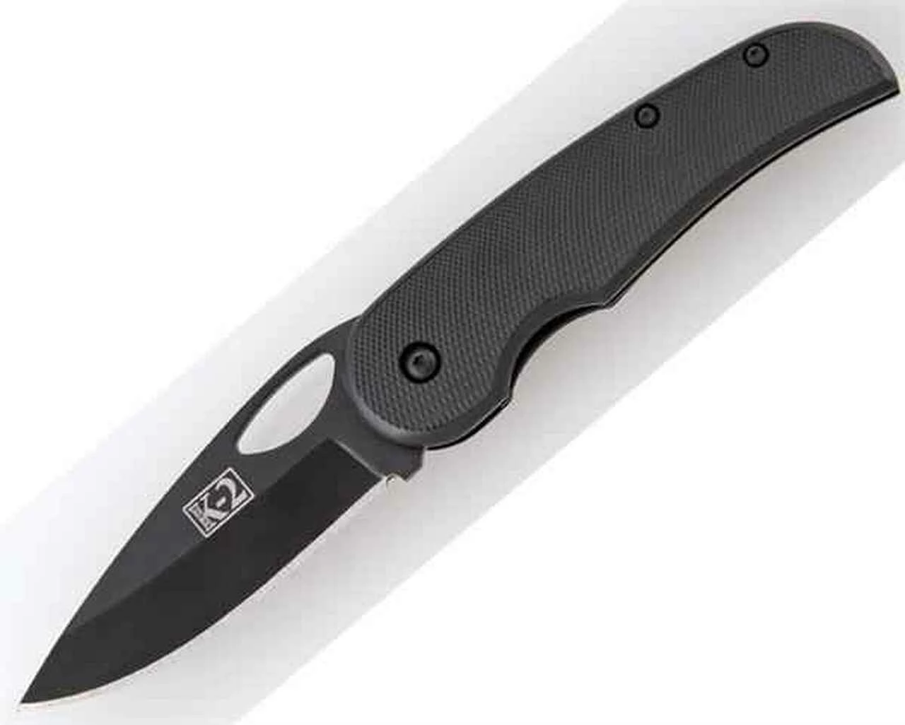 Ka-Bar K-2 Tegu Folder. 4″ closed linerlock. Black finish 3Cr13 stainless hollow ground standard edge blade with thumb slot. Black is etched K-2, Textured black aluminum handles. Black finish stainless pocket clip.