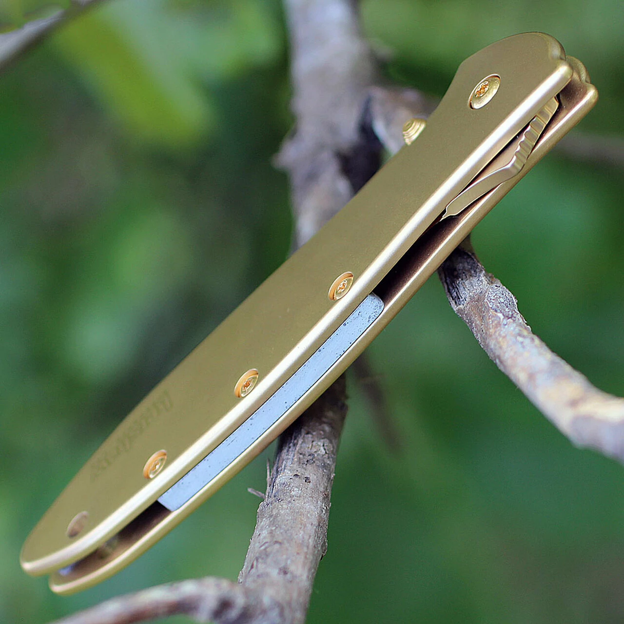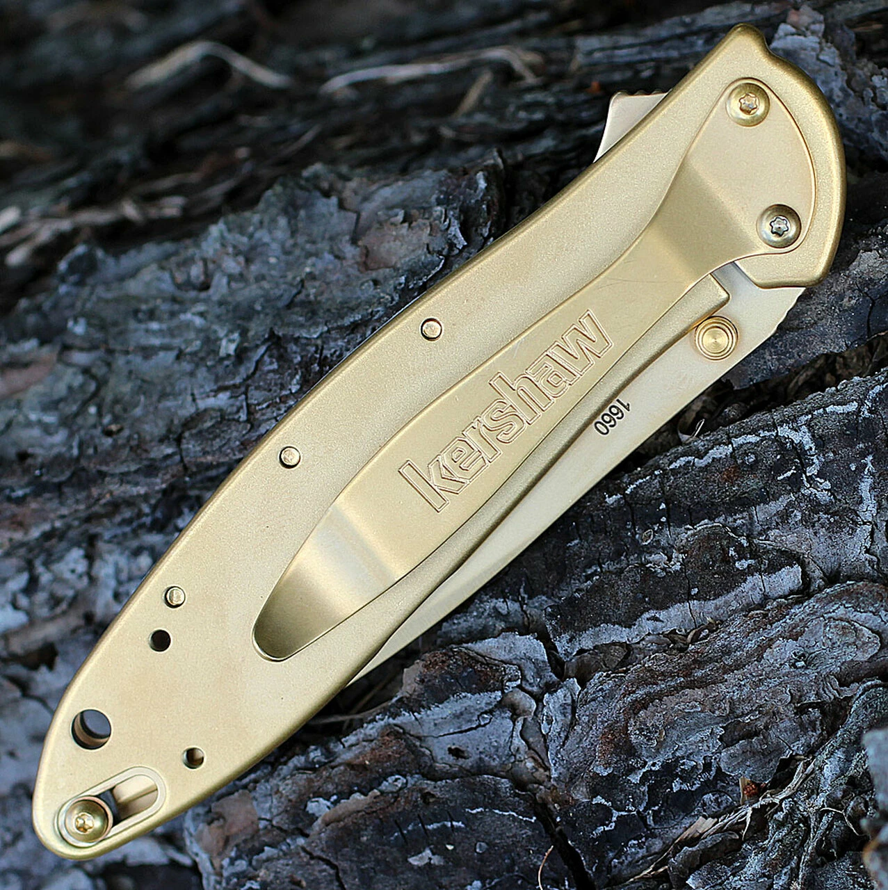 The 24K plated Kershaw Leek just may be the ideal EDC. With its 3-inch blade, the Leek is a good-sized knife, but not too big. The slim design makes it easy to carry and its razor-sharp blade of high-performance Sandvik 14C28N means it can take care of a full range of cutting tasks.