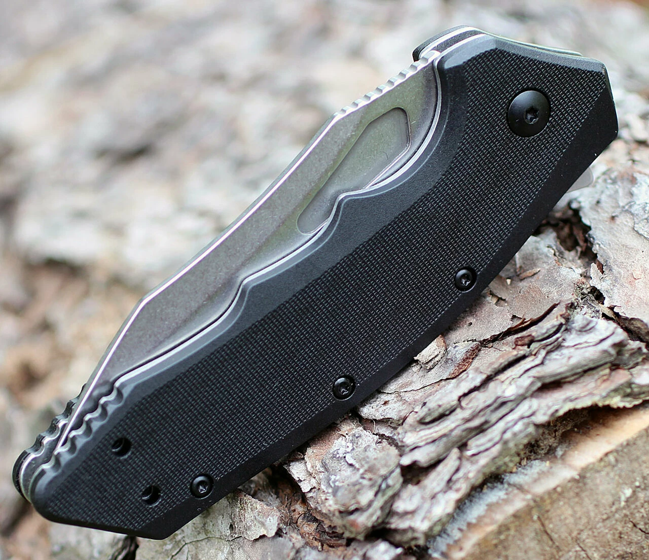The eye-catching blade is made of 8Cr13MoV stainless steel, which can take and hold a sharp edge, yet resharpens easily. Then Kershaw’s heat treatment brings out the best in this top-value steel. The blade is stonewashed to help hide hard use scratches. The result is a very distinctive looking blade that performs well, too. The handle is glass-filled nylon, textured and chamfered for a solid, comfortable grip. Pair that with the deep finger grooves on the underside of the handle and the Flitch offers an exceptionally secure grip. A sturdy liner lock keeps the blade in place during use, then releases easily when you’re ready to EDC it.