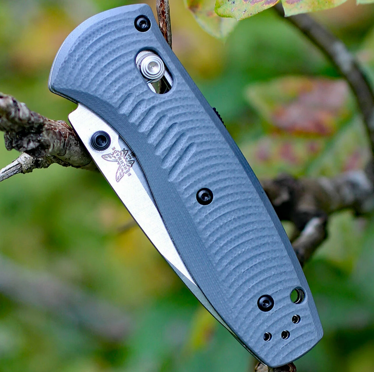 The original AXISAssist now with G10 handles. The Barrage knives were the first folders with both an AXISlock and a spring assist.The AXIS lock is generally considered the strongest locking mechanism available on a folding knife. By adding a spring assist, Benchmade gives the user two great featuresspeed (with the assist), and strength.The Gray G10 enhances the look and feel and upgraded blade steel offers enhanced edge performance. The same awesome mechanism with a new look and feel and a performance upgrade now comes with a black steel backspacer. Whats not to like?