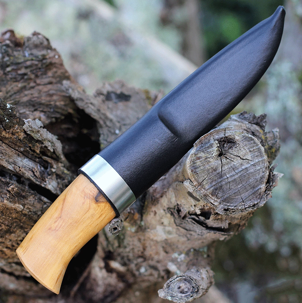 The blade is made of triple laminated stainless steel with a handle of curly birch and walnut with leather spacers. There is a small guard on the handle providing security. It comes with a pouch type sheath reinforced with a metal band without any need for snaps or straps to securely hold the knife.