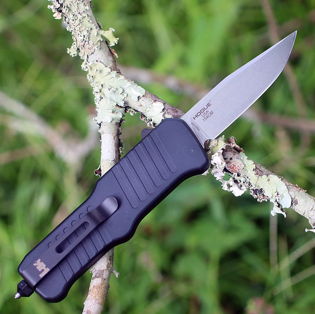 HK Mini Incursion OTF Automatic, 2.95″ Tumbled Clip Point Blade, Matte Black Aluminum Frame-54050