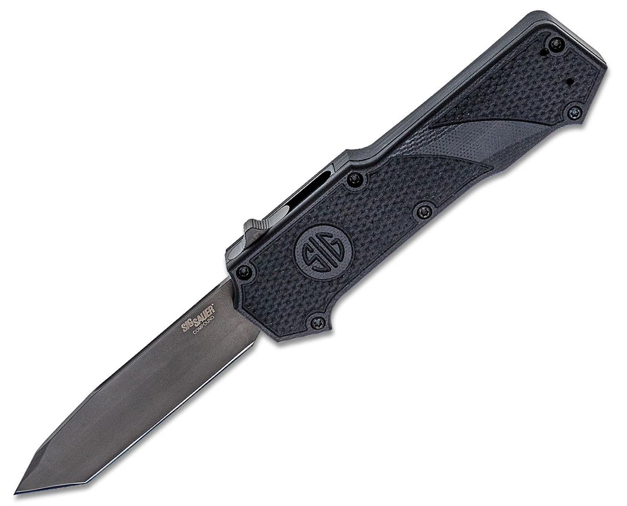 The SIG Sauer Compound Out the Front, or OTF, automatic is a hybrid of G10 and aluminum designed for repeatable one-handed operation in close-quarter situations. A textured G10 frame surrounds a 6061-T6 aluminum chassis for extreme strength without the associated weight. It has the same basic grip as the original Hogue OTF but with a more angular handle shape and a more compact thumb slide. This trigger fires the blade with impressive force and retracts is just as fast. Built to last, the Compound will fire consistently time and time again with repeated reliability.