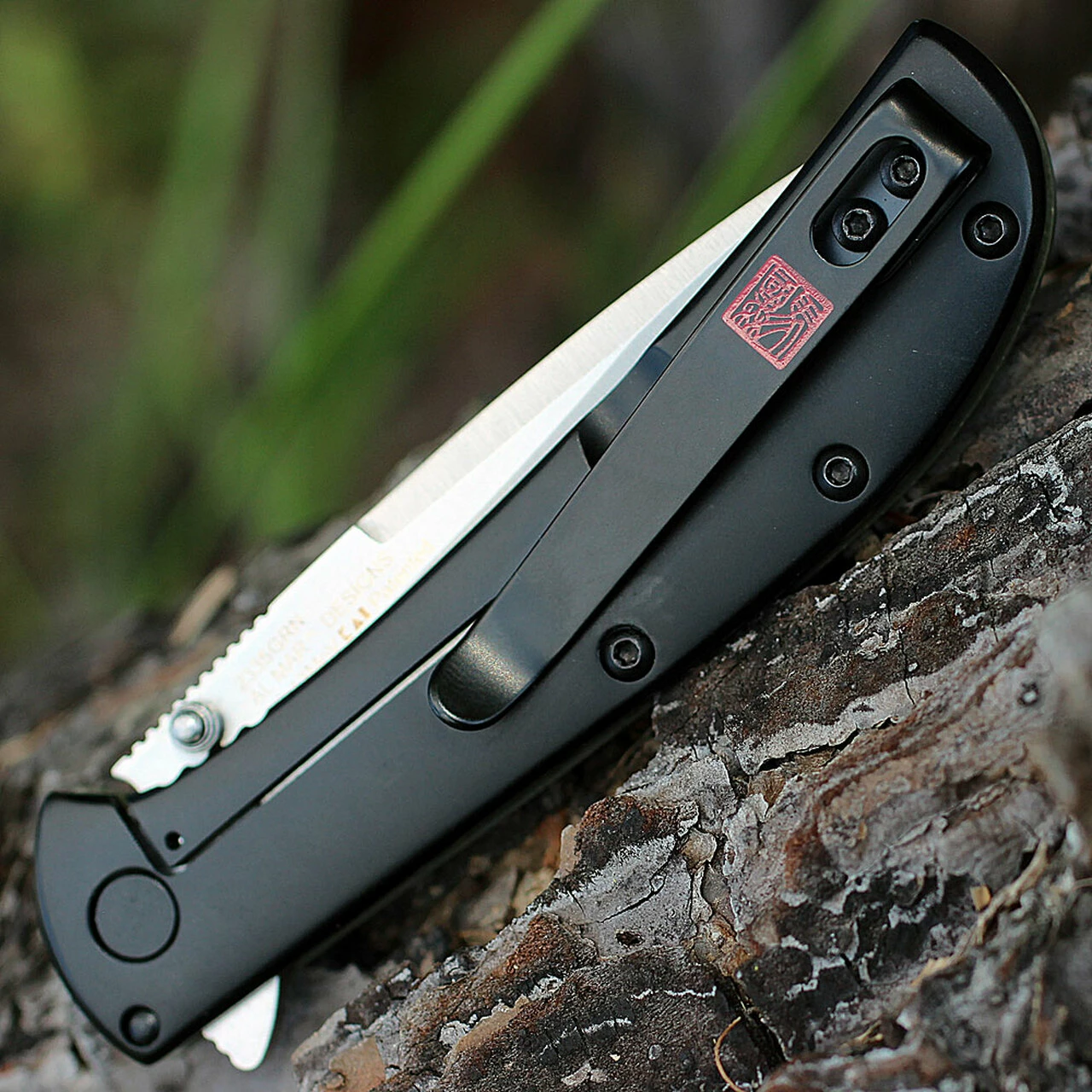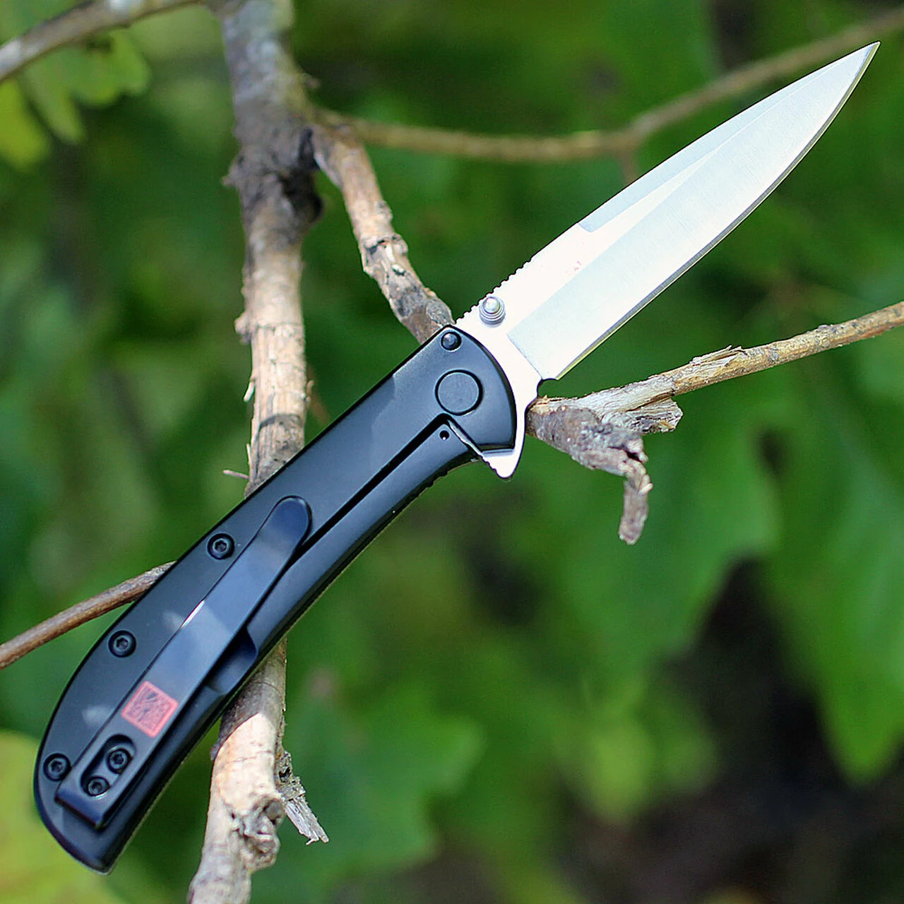 The AM-3 features SpeedSafe assisted opening for quick and simple one-handed opening. Just pull back on the flipper or push on the thumbstud. The blade is quality 8Cr13MoV stainless steel with a handsome satin finish and a top swedge. The front handle scale is G-10—crowned and polished for a smooth feel and classy look. The back is pure steel with a sturdy frame lock to keep the blade in position until you release it. The AM-3 also features a deep-carry pocketclip with AL MAR™ KNIVES’ red logo emblem and—for an extra measure of visual interest—we used red standoffs.