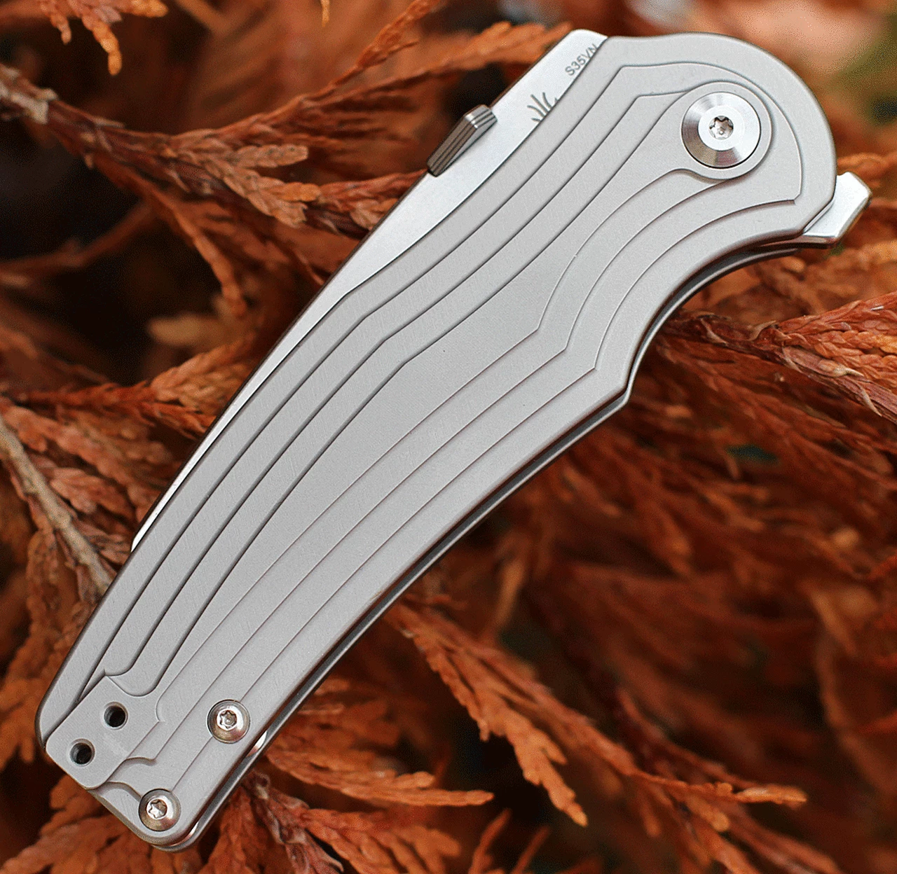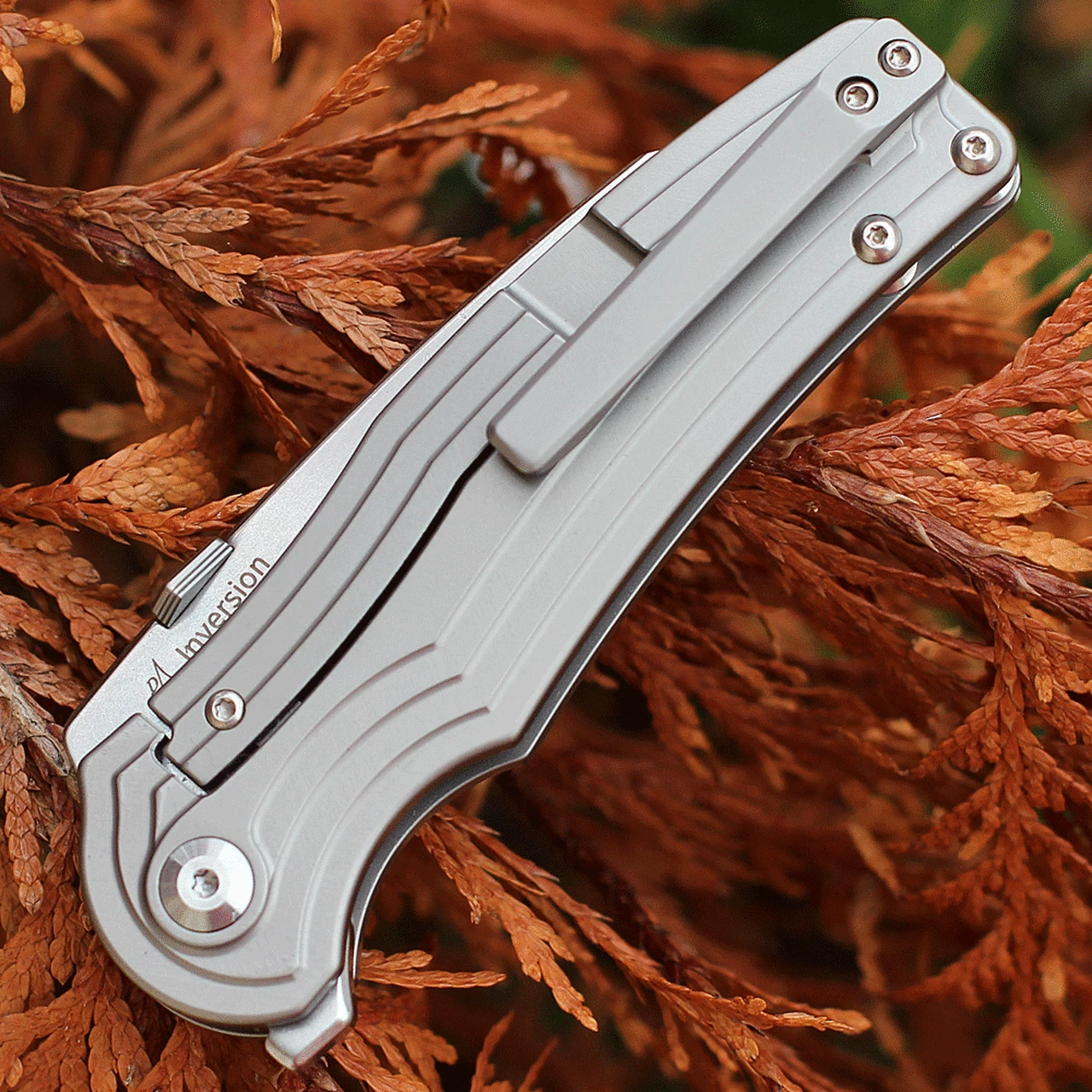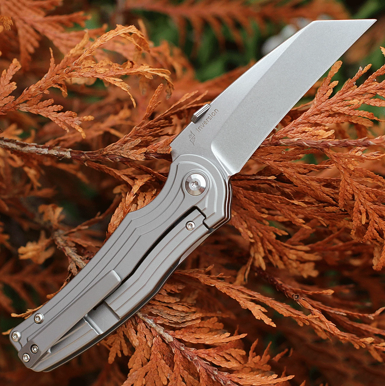 The design of Inversion is very special. It is a titanium frame lock knife with the edge on the back of the blade instead of the front, thus living up to its name. Its appearance is considered as a woodpecker. It has stonewashed finished S35VN blade and milled titanium handle. Reversible pocket clip makes this knife perfect for left hand, right hand, both users.