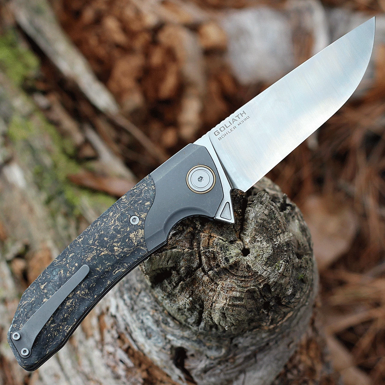 Maxace Knives Goliath 2.0 (MGL313) – 4.3″ M390 Satin Drop Point Blade, Luminous Marble Carbon Fiber Handle with Gray Stonewashed Bolster