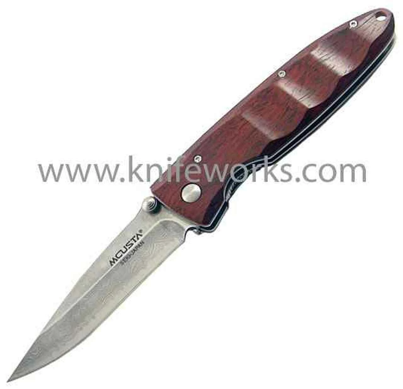 Mcusta Damascus Basic Folder Cocobolo. 4 1/4″ closed linerlock. 33 layer nickel damascus steel blade with a VG-10 core (RC 59-50) and thumb studs. Contoured Cocobolo finger groove handles. Pocket clip. Specially designed Teflon washer system for silky smooth action. Hand finished.