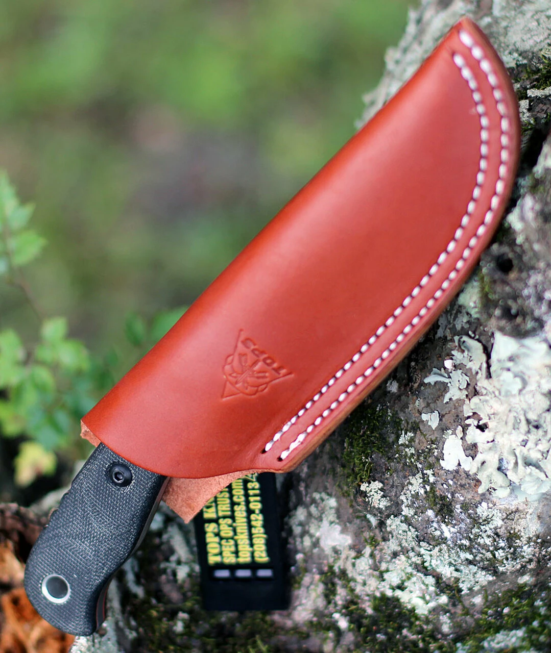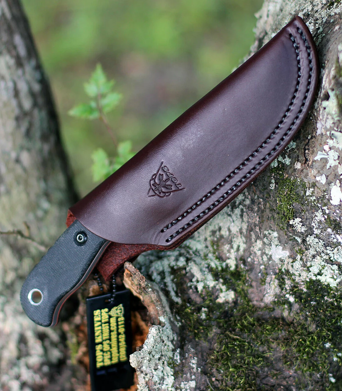 THE DESIGNER, LEO ESPINOZA, CREATED A NEW LOOK ON THIS SPECIFIC BLADE. AT TOPS, WE CALL IT BLACK RIVER WASH. THE UNCOATED FINISH CLEARLY SHOWS THE HEAT TREAT LINE ALONG THE BLADE EDGE. THE DARKENED-STEEL PATTERN IS UNIQUE ON EVERY BLADE. THIS CREATES THAT BROKEN IN, RUSTIC LOOK AND FEELS JUST LIKE AN OLD PAIR OF COMFORTABLE BOOTS. THE DARKENED MICARTA SCALES ARE SCREWED ONTO THE HANDLE AND A LARGE CORD HOLDER IS ACCENTUATED AT THE BACK OF THE HANDLE. THE HANDLES ARE DESIGNED AND BUILT FOR A POSITIVE GRIP AND FOR EXTENDED PERIODS OF USE. A SIMPLE AND USEABLE DESIGN IS REINFORCED BY A STURDY 3/16 THICK BLADE AND FULL TANG HANDLE.