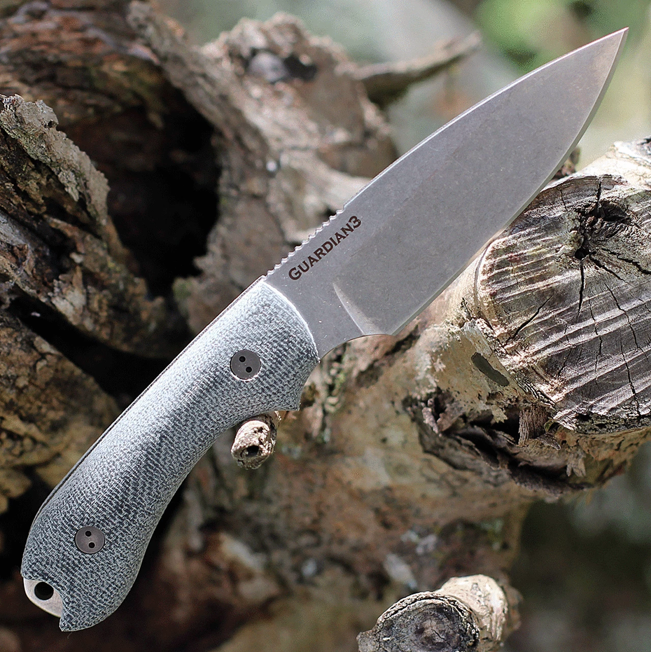 This Guardian3 pocket knife is an ideal EDC knife. A 3.5 inch Bohler M390 steel fixed blade with a full tang has a stonewashed blade with a sabre grind. The Guardian3 is a great tool that can be easily carried and concealed on your belt so you can use it throughout the day. Whether youre working in a warehouse, with wiring or boxes, or you just need to open a bottle at home, the Guardian3 can take care of it.