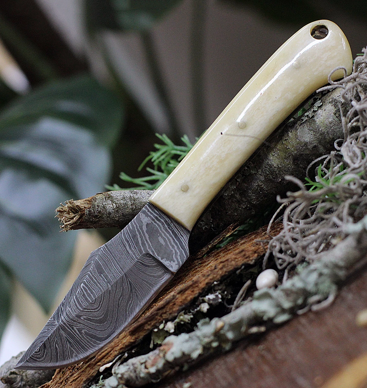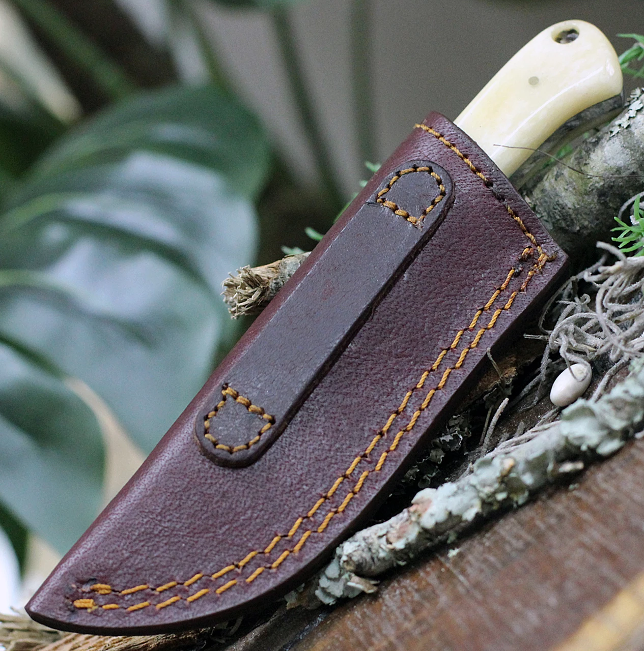 6.5″ overall. 3″ Damascus steel skinner blade. White smooth bone handle. Full tang. Lanyard hole. Brown leather belt sheath.