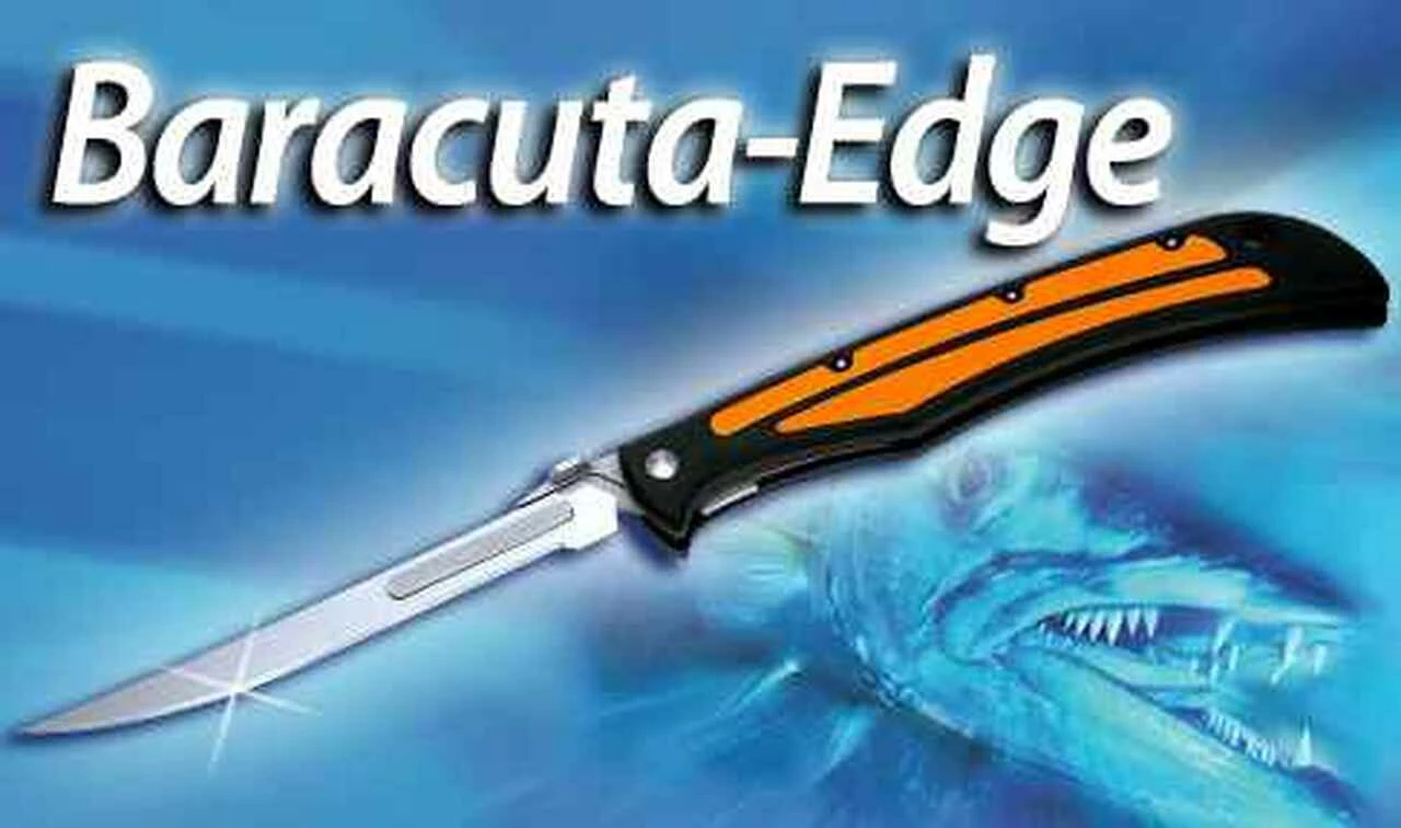 The Baracuta-Edge Folding Fillet Knife features five inches of micro-honed Japanese stainless steel, a rugged black Zytel plastic handle with orange rubber inserts for better grip and less slippage. This folding fillet knife has an open back for easy cleaning, plus ambidextrous thumb studs and removable pocket clip. Liner-lock construction. Same great concept as the Havalon Piranta, but larger and longer. Overall length is 11 inches yet weight is only 3 ounces. NEVER LOSE YOUR EDGE. Comes with 5 additional stainless steel #127XT fillet blades.