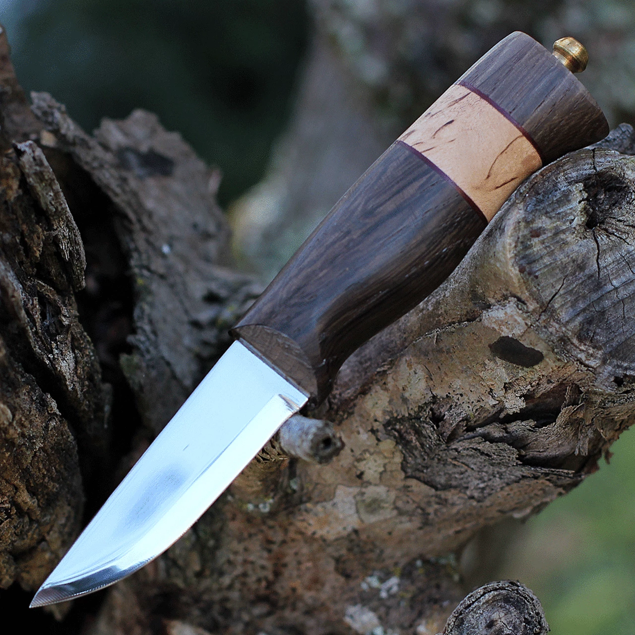 Handmade in Norway using darkened oak, curly birch and red leather inserts, the handle shape features a slight pommel at the end, as well as a small finger guard and thumb notch for maximum dexterity and superior handling. The 69 mm blade is made with Helles triple laminated stainless steel for unparalleled strength, sharpness and corrosion protection.