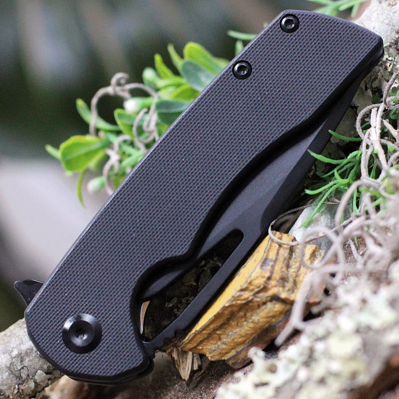 - Black G10 handle for a smooth gripping surface that is comfortable in the pocket or hand.
