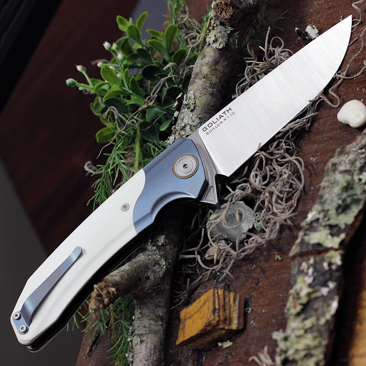 Maxace Knives Goliath 2.0 MGL204, 4.33″ Bohler K110 Satin Plain Blade, White G-10 Handle w/Blue Bolster