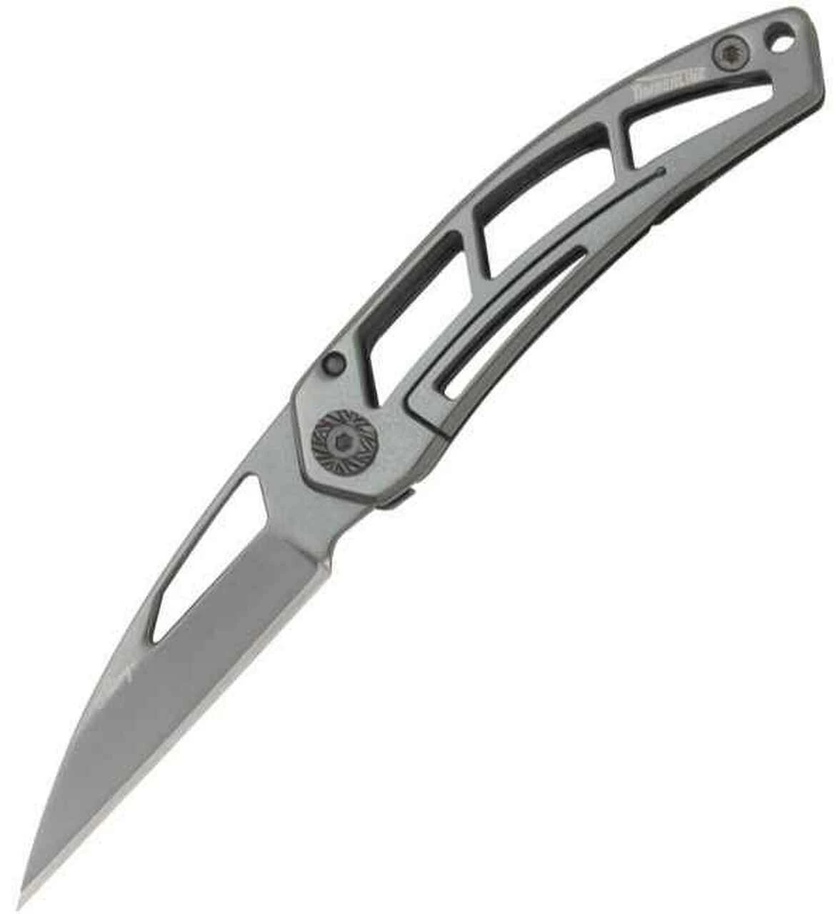 Timberline Alary. Money Clip Knife. 2 3/4″ closed framelock. AUS-8A stainless blade. Skeletonized 420 J2 stainless frame with stainless pocket clip. Both blade and frame have a charcoal titanium nitride coating. Aluminum presentation case.