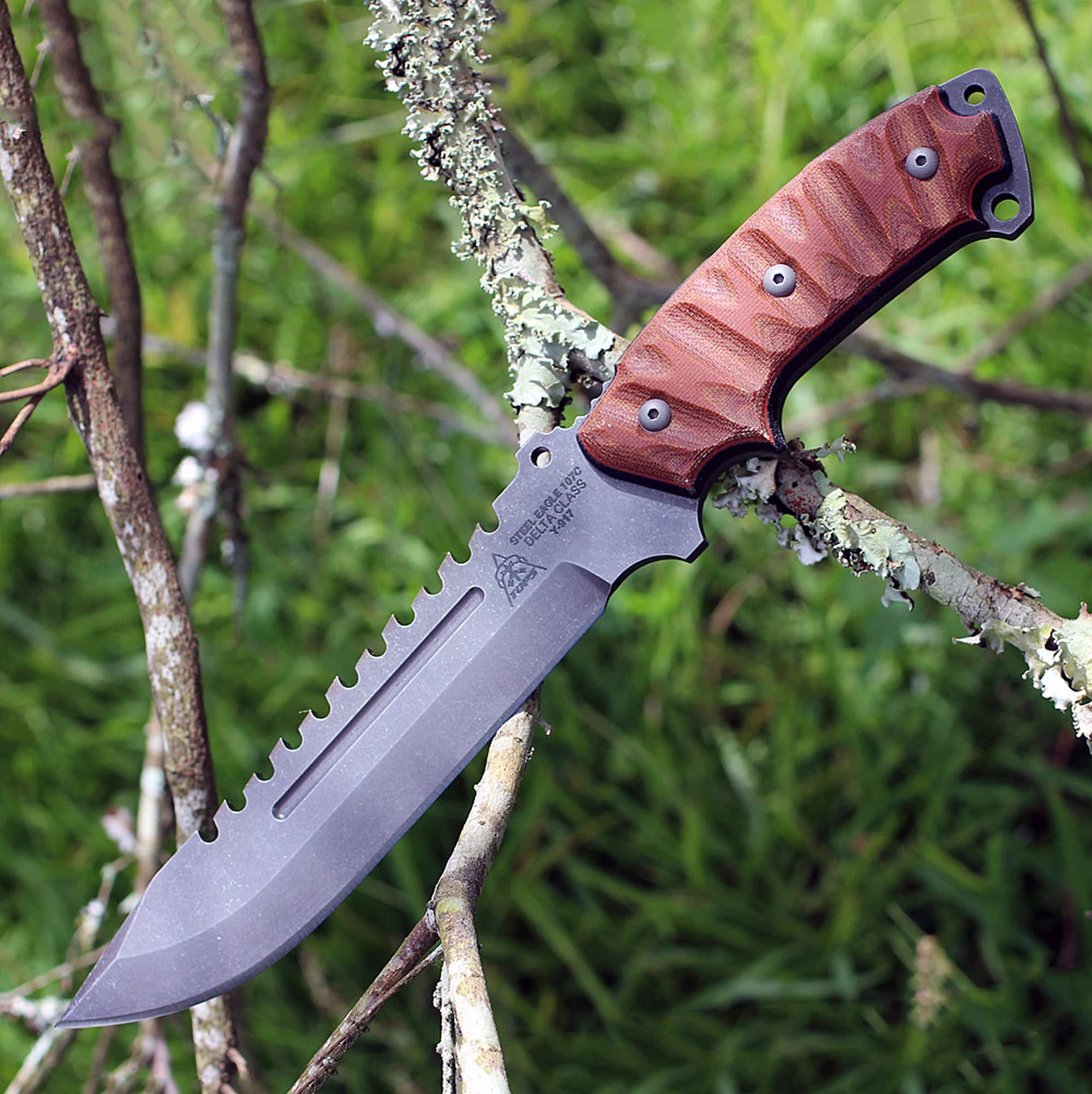 This Steel Eagle Delta Class model also comes with the Acid Rain finish, sandwiched Micarta, and the tan Kydex just like its tanto point counterpart. It also comes with the same strength, durability, versatility, and dependability as the 107D.