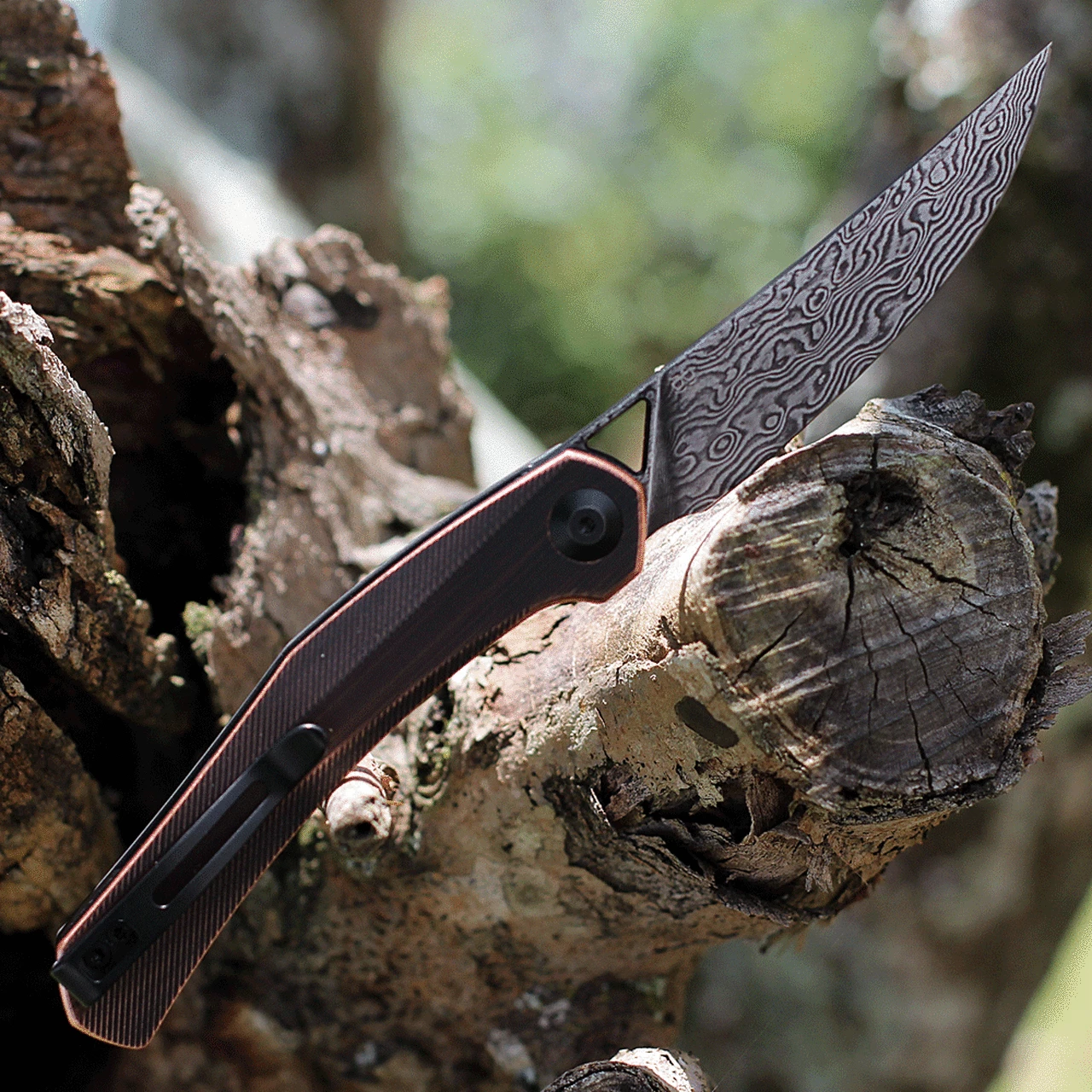 CIVIVI Lazar Front Flipper Knife (C20013-DS1), 3.31″ 10Cr15CoMoV Black Hand Rubbed Damascus Trailing Point Blade, Black Hand Rubbed Copper Handles