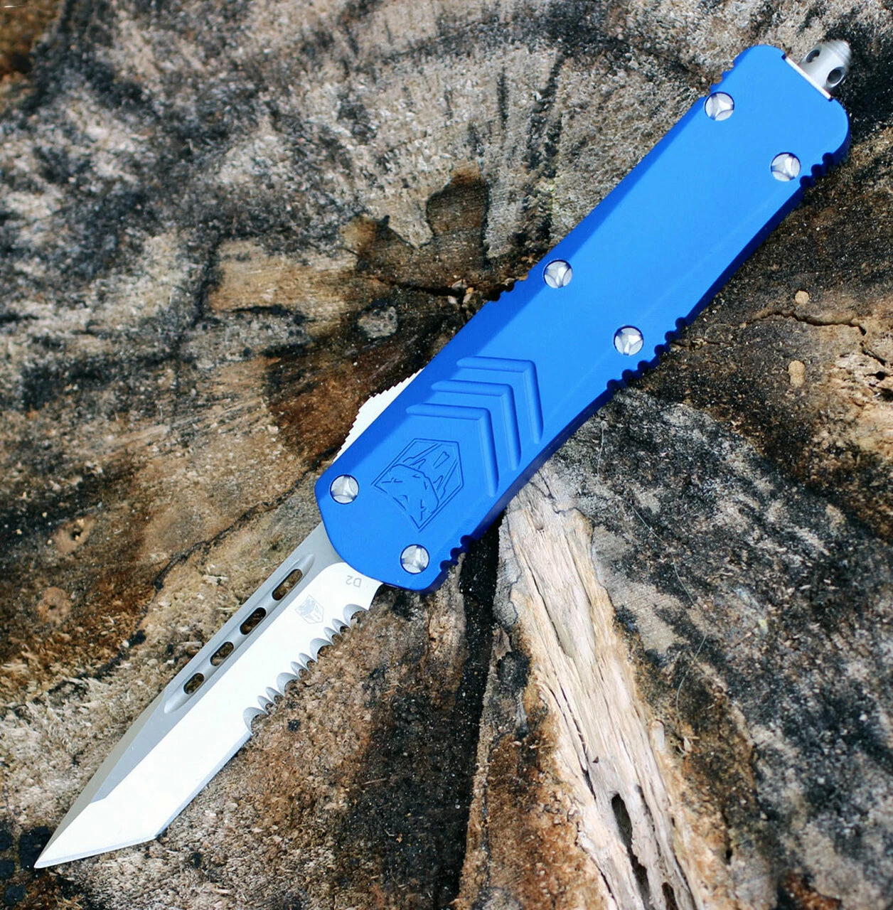 CobraTec Blue FS-X OTF Knife CTKMBLUFS-XMTS, 3″ D2 Steel Tanto Serrated Blade, Blue Aluminum Handle