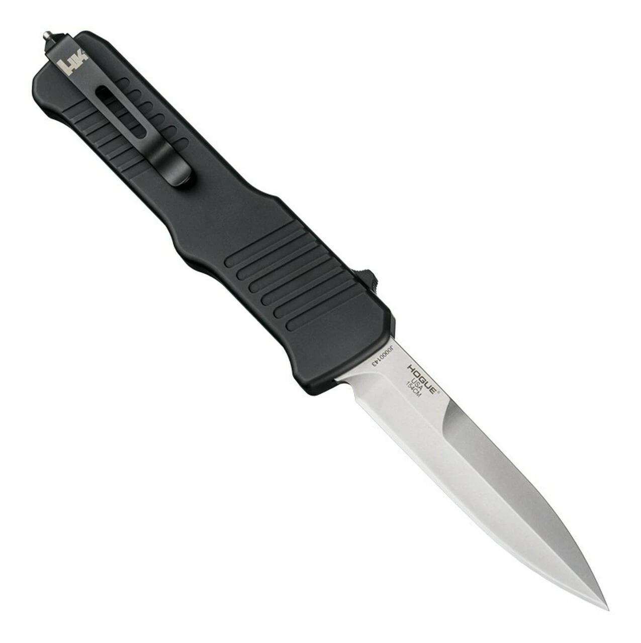 The HK Incursion OTF Auto employs a switch operated blade which instantly deploys and retracts out-the-front for total control. Its versatile design allows easy storage and quick response when needed. It features a nearly four-inch cryogenically heat treated 154CM stainless steel blade with heavy-duty 6061-T6 machined aluminum handles. 154CM is a hard-working, highly stain-resistant steel that takes and holds a keen edge. The Incursion is designed and built for speed and reliability every time and includes a carbide glass breaker and deep carry bayonet-style pocket clip.