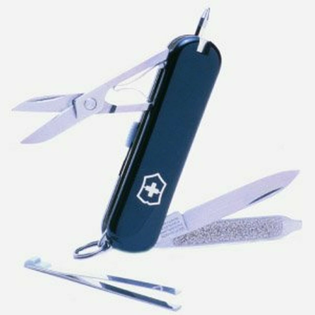 2 1/4″ closed. Features pen blade, nail file with screwdriver tip, scissors, tweezers, retractable ball point pen and keyring.