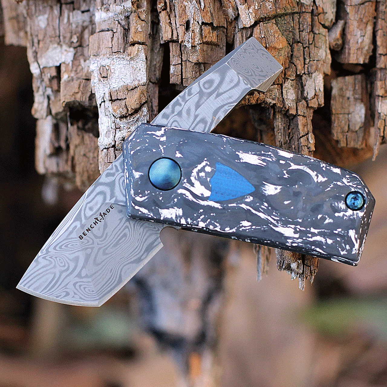 Benchmade 602-211 Gold Class Tengu Tool, 1.14″ Damasteel Tanto Blade, White & Black Marbled Carbon Fiber w/Blue G10 Shield Inlay