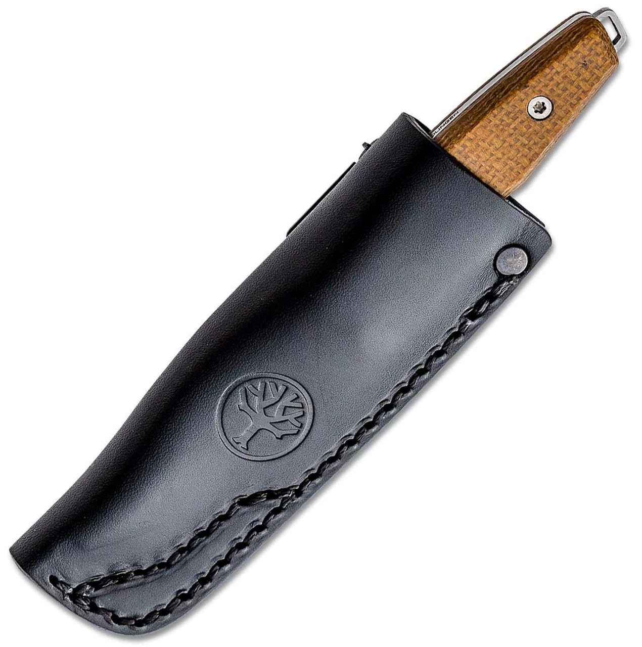 Boker AK1 Fixed Blade 123502, 3″ RWL-34 Satin Reverse Tanto Blade, Mustard Burlap Micarta Handle, Black Leather Sheath