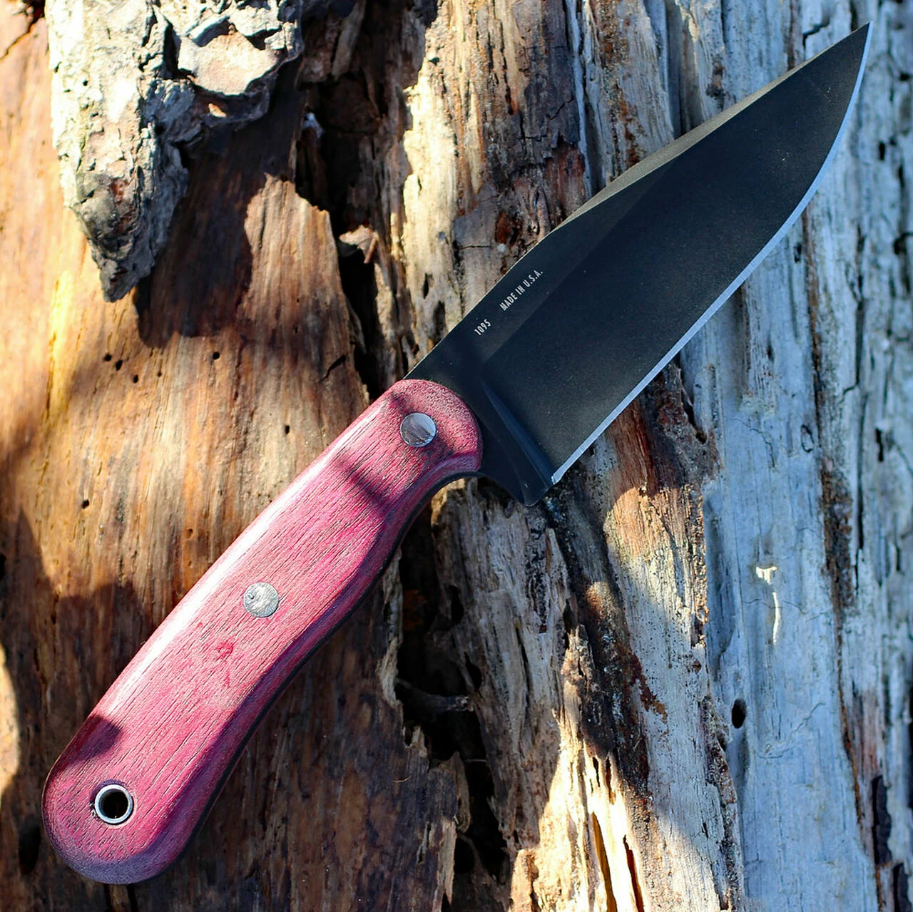 1095 Steel: Cryogenically hardened to 56-58 Rockwell. Black Oxide Finish. Hollow grind.