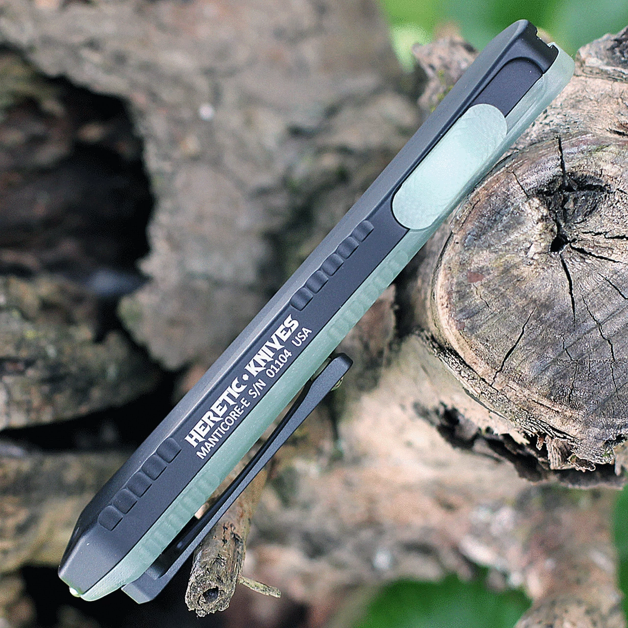 Heretic Knives Manticore E OTF Automatic H026B-10A-JADE, 3.19″ Elmax Two-Tone Black DLC Bowie Blade, Black Aluminum & Jade G-10 Handles