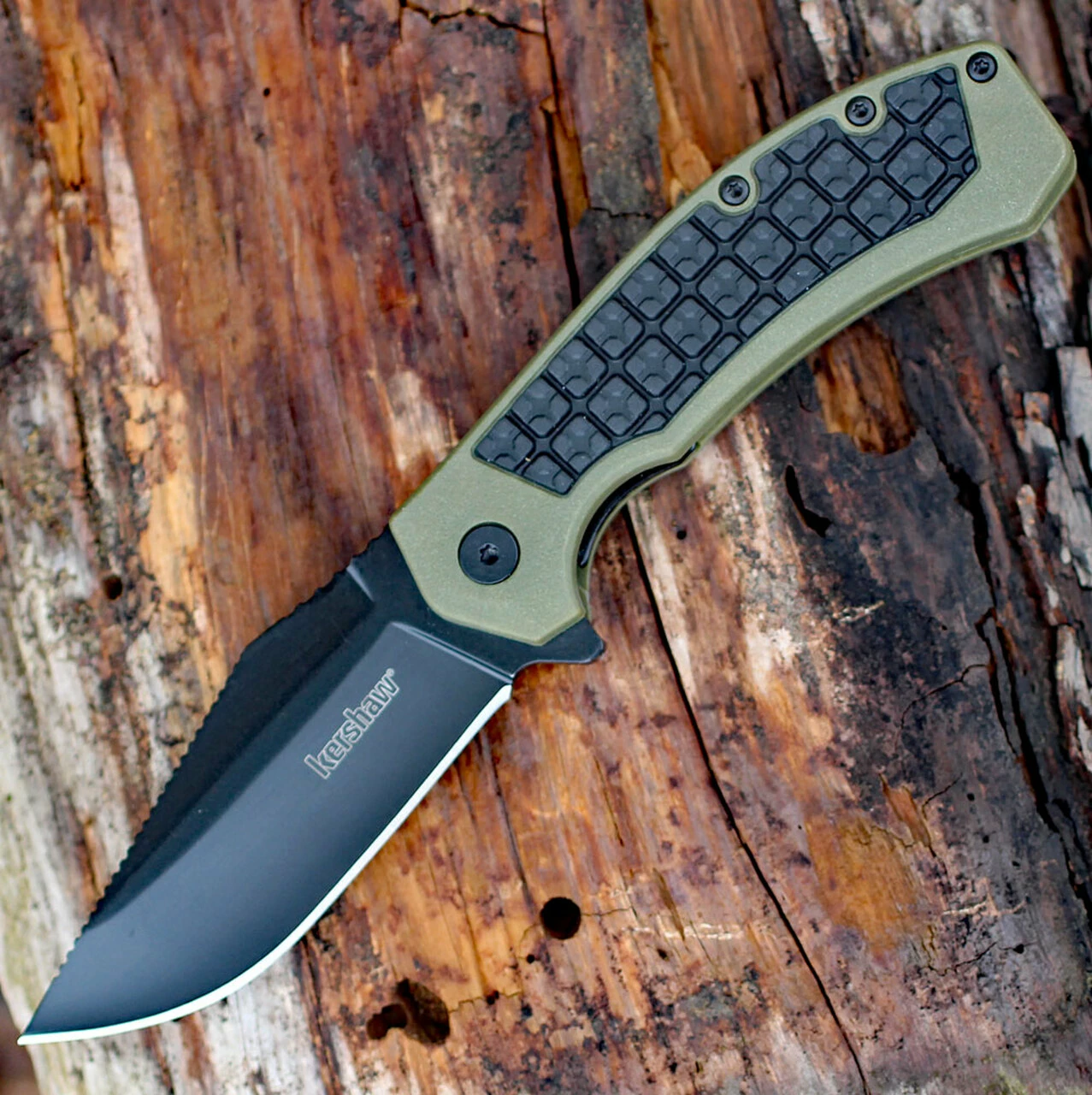 The handle is olive drab glass-filled nylon with a rubberized, super-grippy and textured overmold. Heavy jimping on the blade back adds additional grip. To bring this knife in at an adventure-ready weight, Kershaw adds an inset liner lock, which provides the blade-lockup security of a locking liner with less bulk and at a lighter weight.