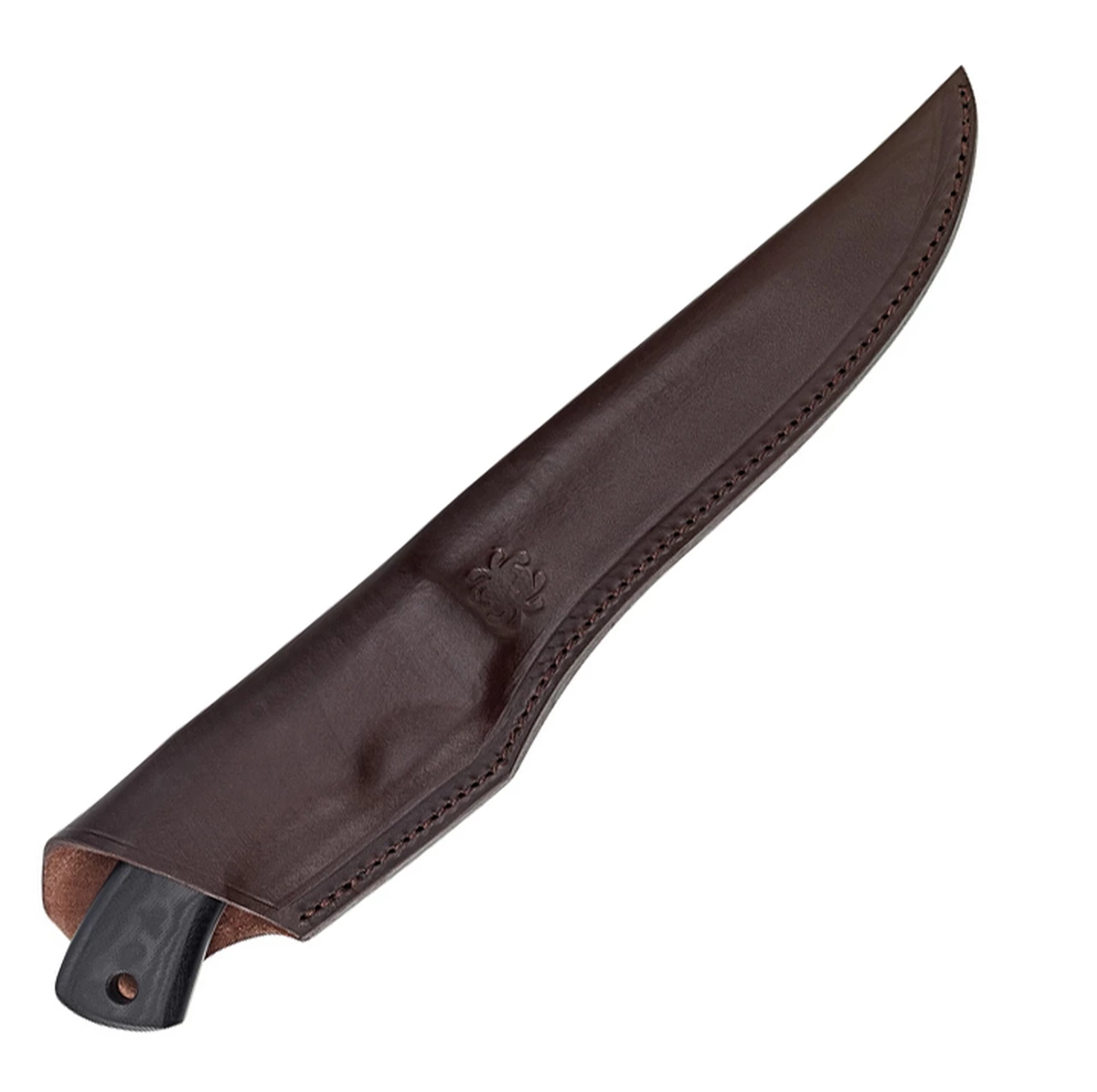 Custom knifemaker Stuart Ackerman specializes in extremely practical, incredibly functional designs inspired by his own real-world experience as an avid outdoorsman and a former infantryman in the Angolan Bush War. Based on his best-selling handmade Slither model, the Spyderco Sustain is a truly formidable fixed-blade knife that reflects the hard-won insights of its designer. The Sustains broad blade is saber ground from premium CPM20CVan advanced particle metallurgy stainless steel renowned for its edge-holding ability and extreme corrosion resistance. A prominent swedge (unsharpened bevel) on the spine of the blade reduces weight and ensures an acute point without sacrificing strength. It also balances the handles sturdy, full-tang construction to give the knife an amazingly deft, lively feel in the hand. The handles refined shape includes a subtle sub-hilt for enhanced purchase and an understated, but highly effective, integral guard. Its smooth G-10 scales are meticulously radiused and secured to the tang with concealed pins to offer a clean, extremely comfortable grip. To protect the knife when not in use and provide comfortable, convenient carry in the field, the Sustain comes complete with a handsomely crafted leather pouch-style sheath.