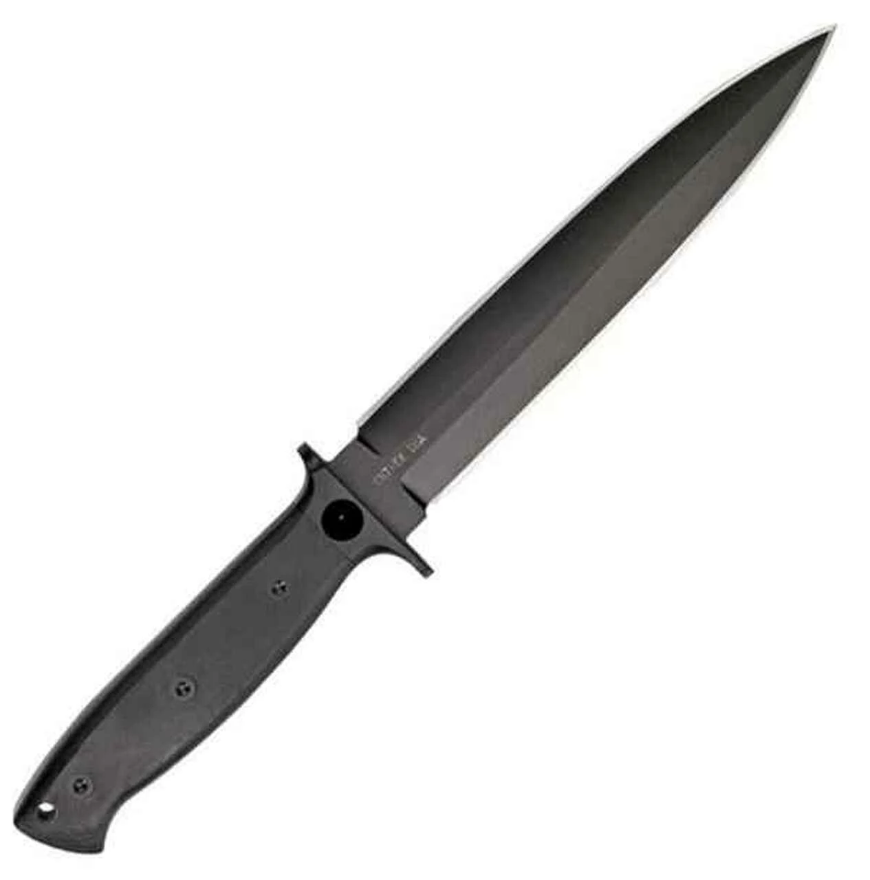 Close Combat MKII. 12″ overall. 7″ double edge dagger black finish blade. Full tang. Black micarta handles. Black Kydex belt sheath.