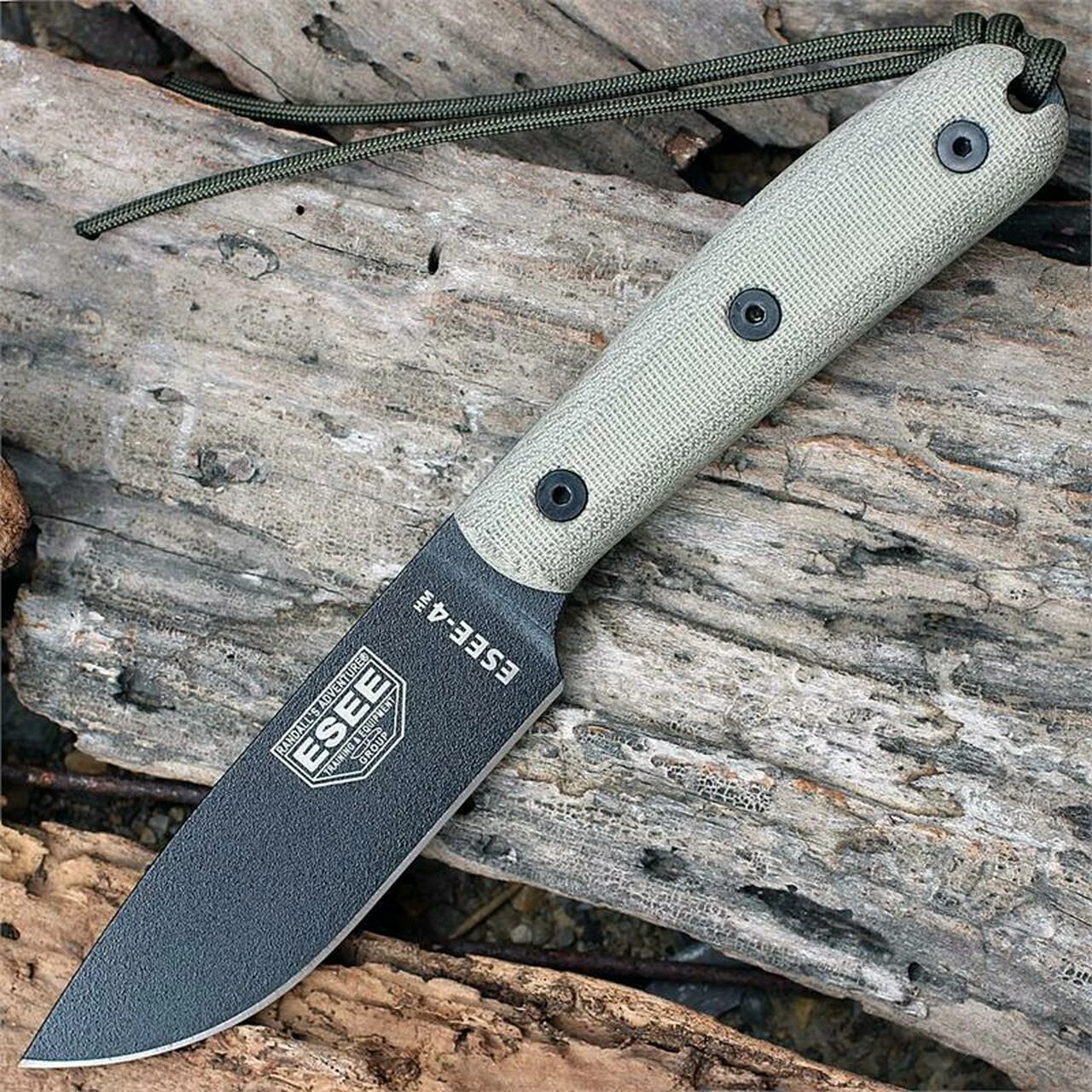 ESEE Model 4, 4HM-B, Black Plain Edge, Modified Canvas Handles, Brown Leather Sheath