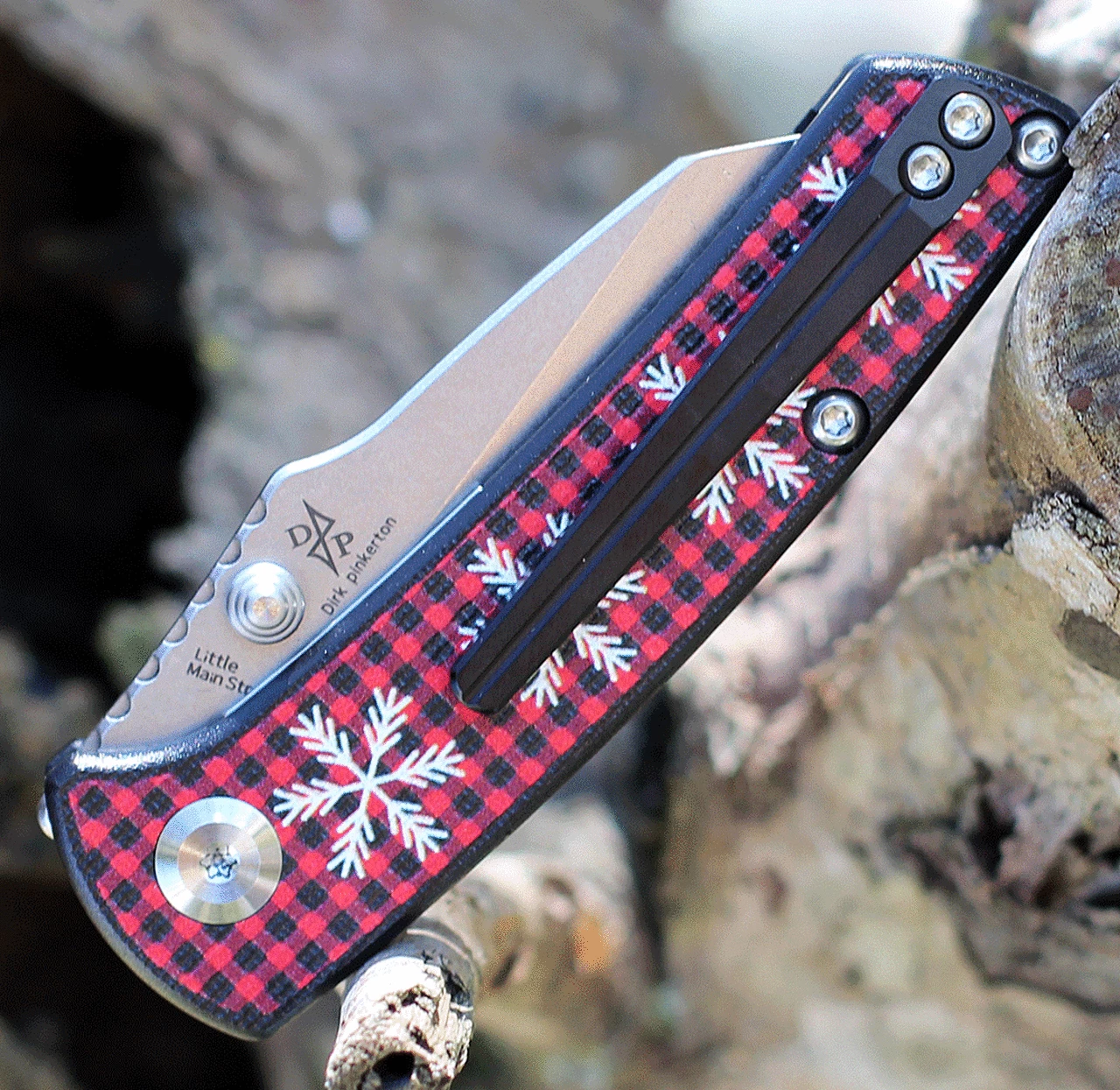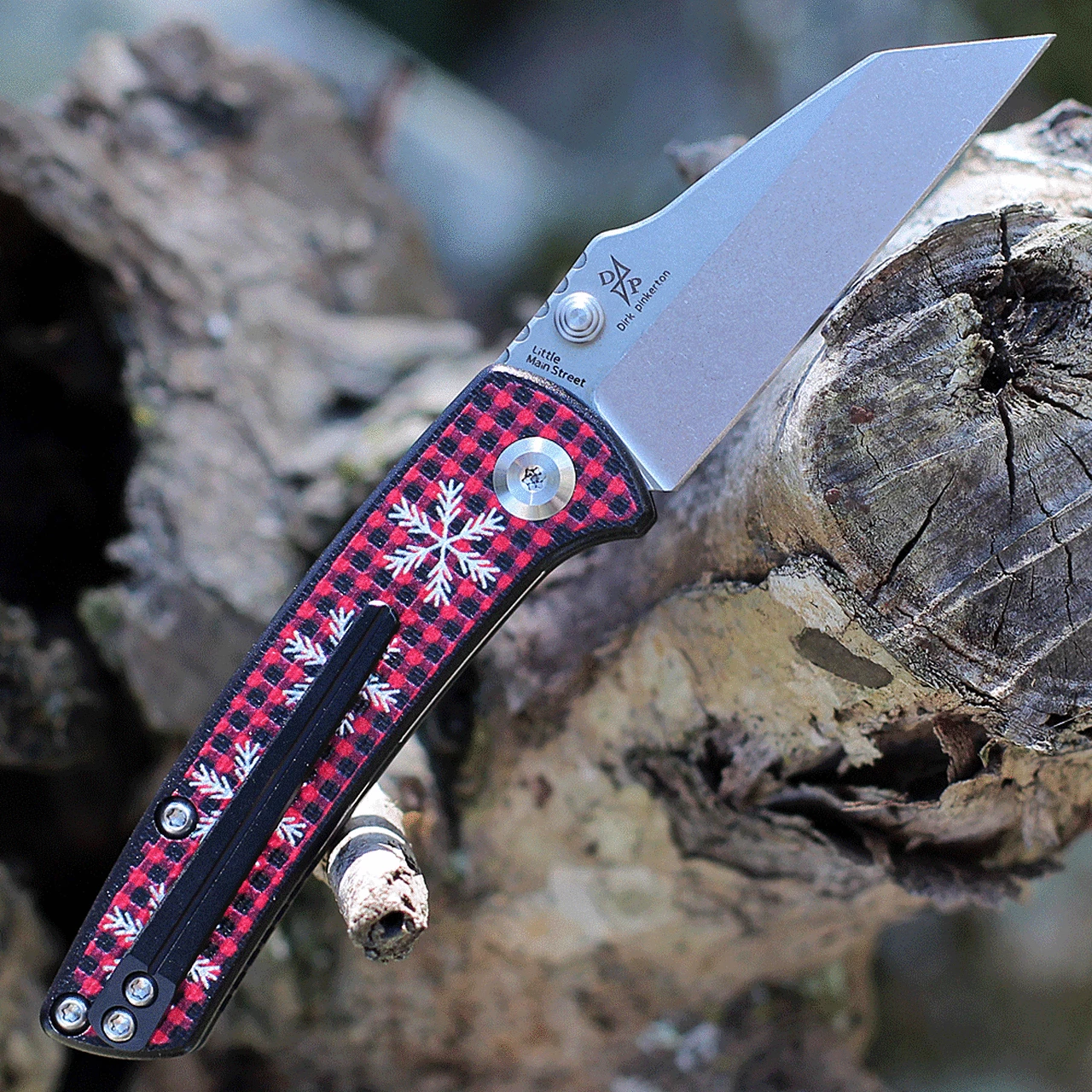 The Little Main Street is knife designed to go most anywhere and still be an effective tool. The wharncliff blade is the most versatile blade shape; especially for a small knife. This knife features stunning red plaid with snowflake cutouts on the handle.ย