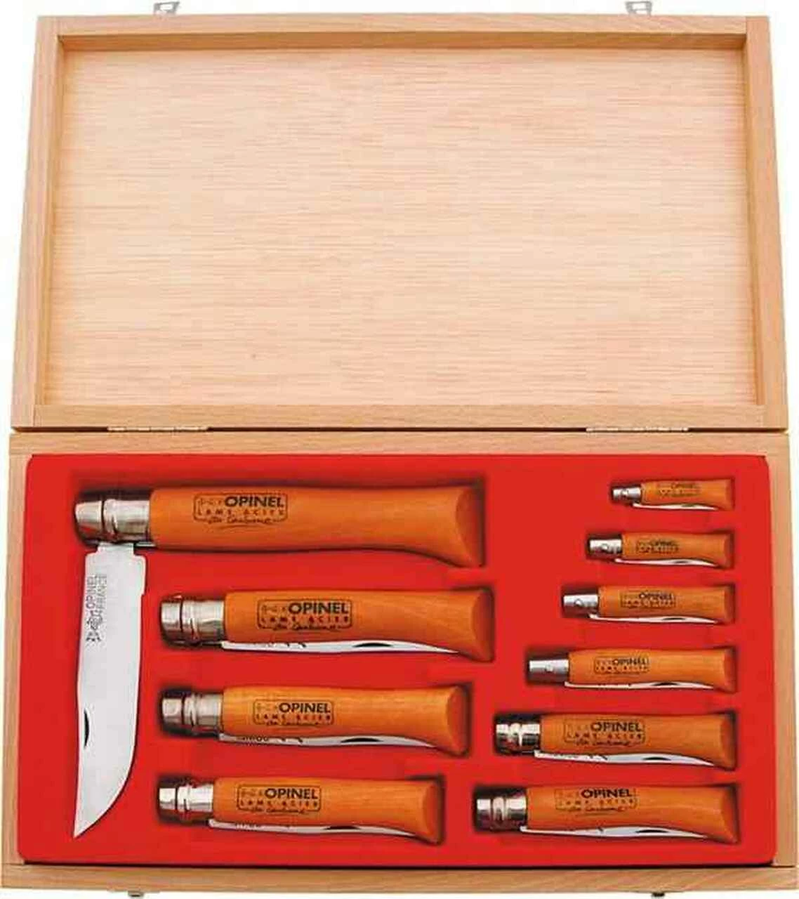 Opinel Ten Piece Carbon Set. Includes an Assortment of Ten Folding Knives of Various Sizes