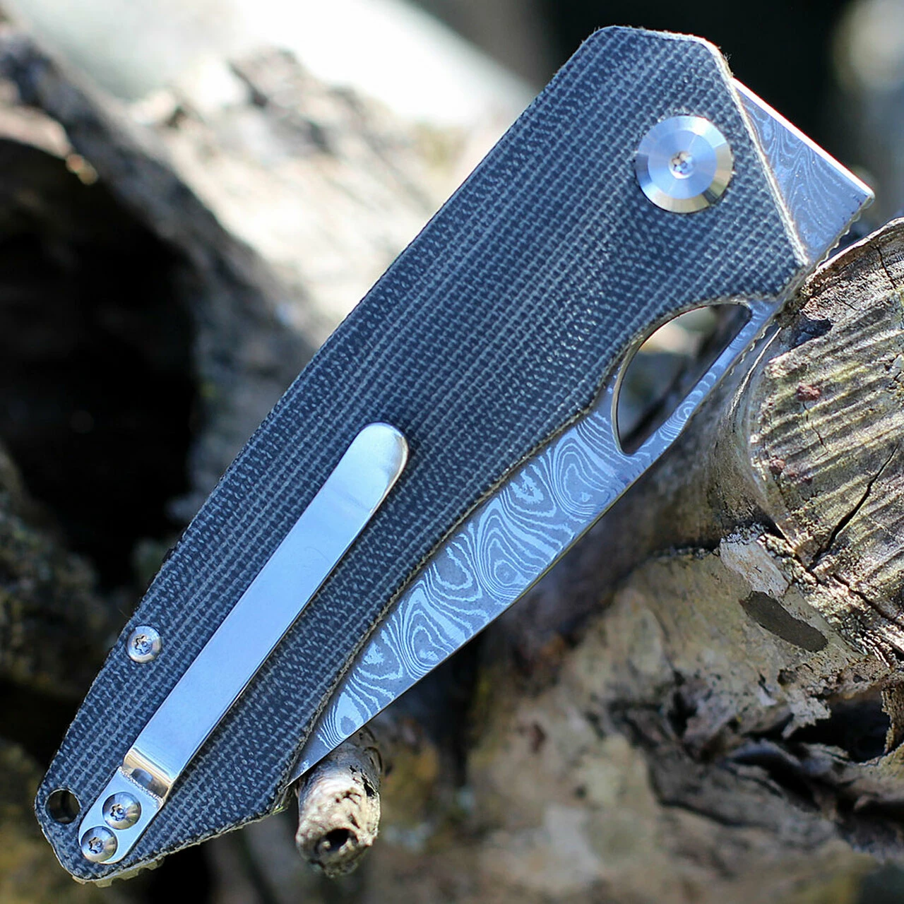 PMP Knives Spartan Front Flipper (SPBKMDM) – 3.25″ Damascus Drop Point Blade, Black Micarta Handle
