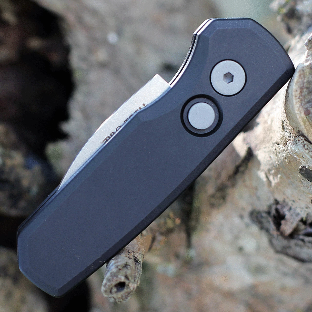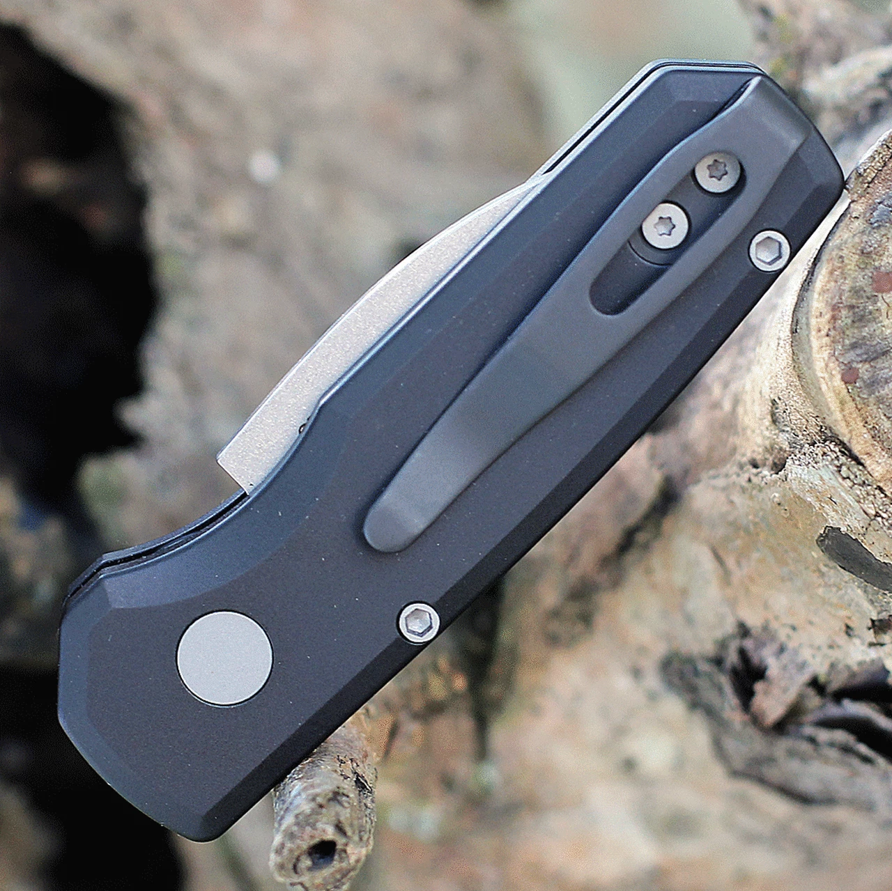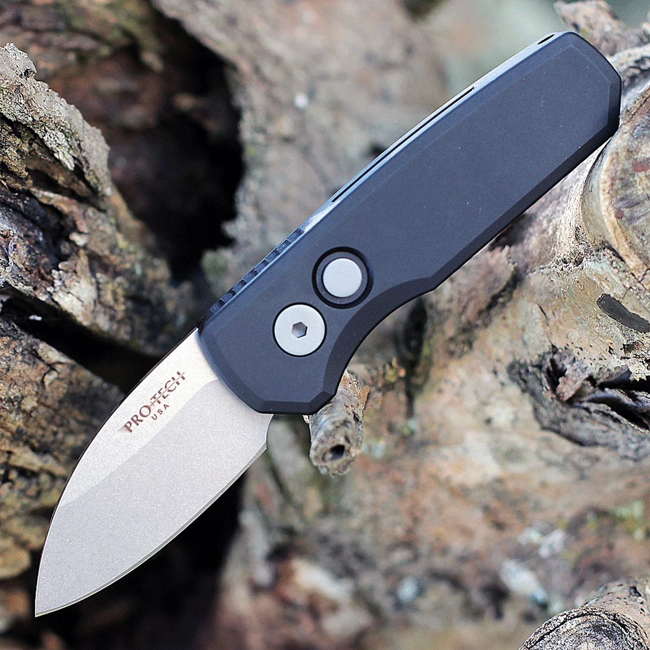 Pro-Tech Runt 5 Automatic (R5101) – 1.9″ 20CV Stonewashed Wharncliffe Blade, Black Aluminum Handle
