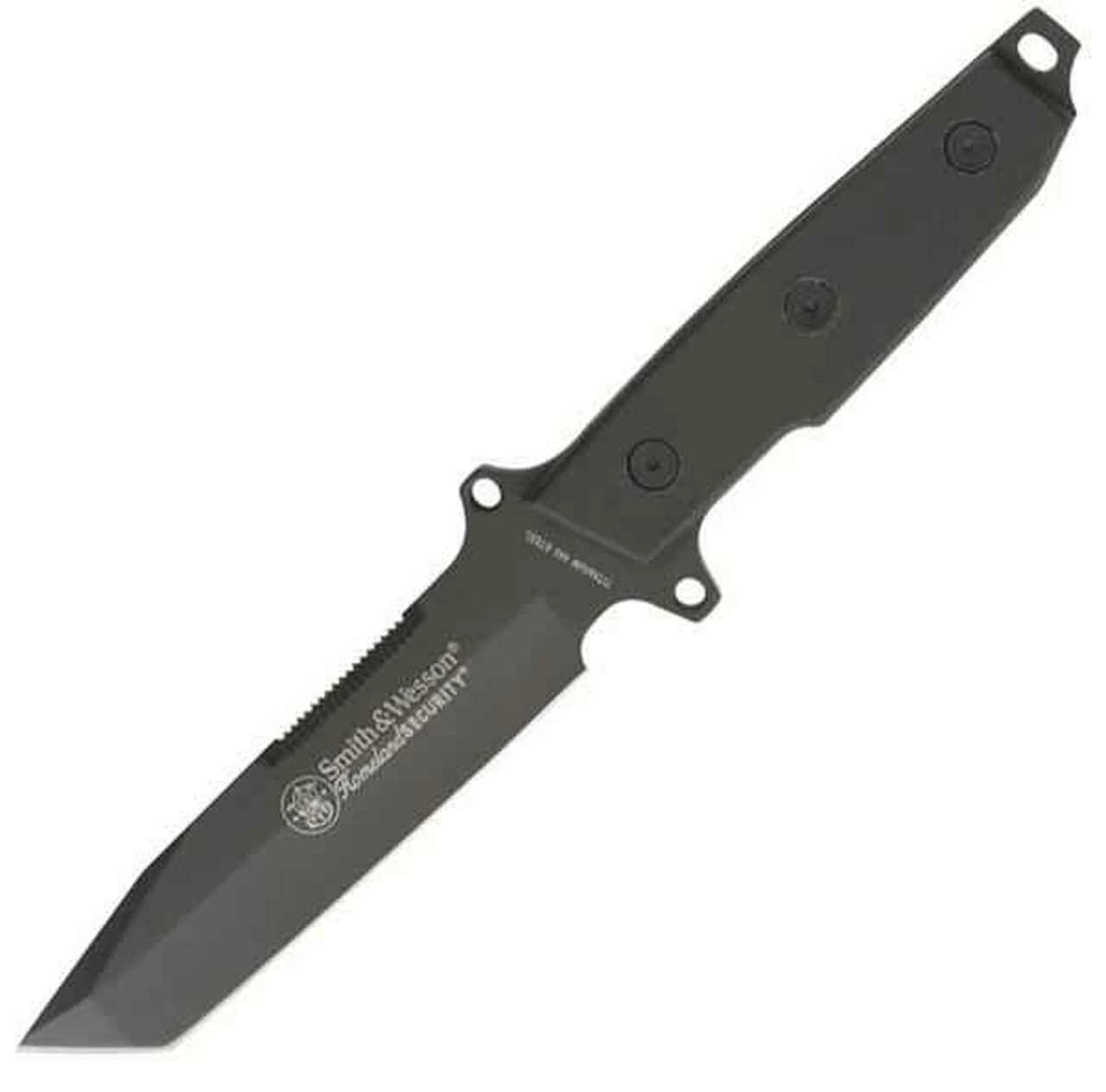 Smith & Wesson Homeland Security Tanto. 6″ black coated stainless tanto blade with partial sawback.