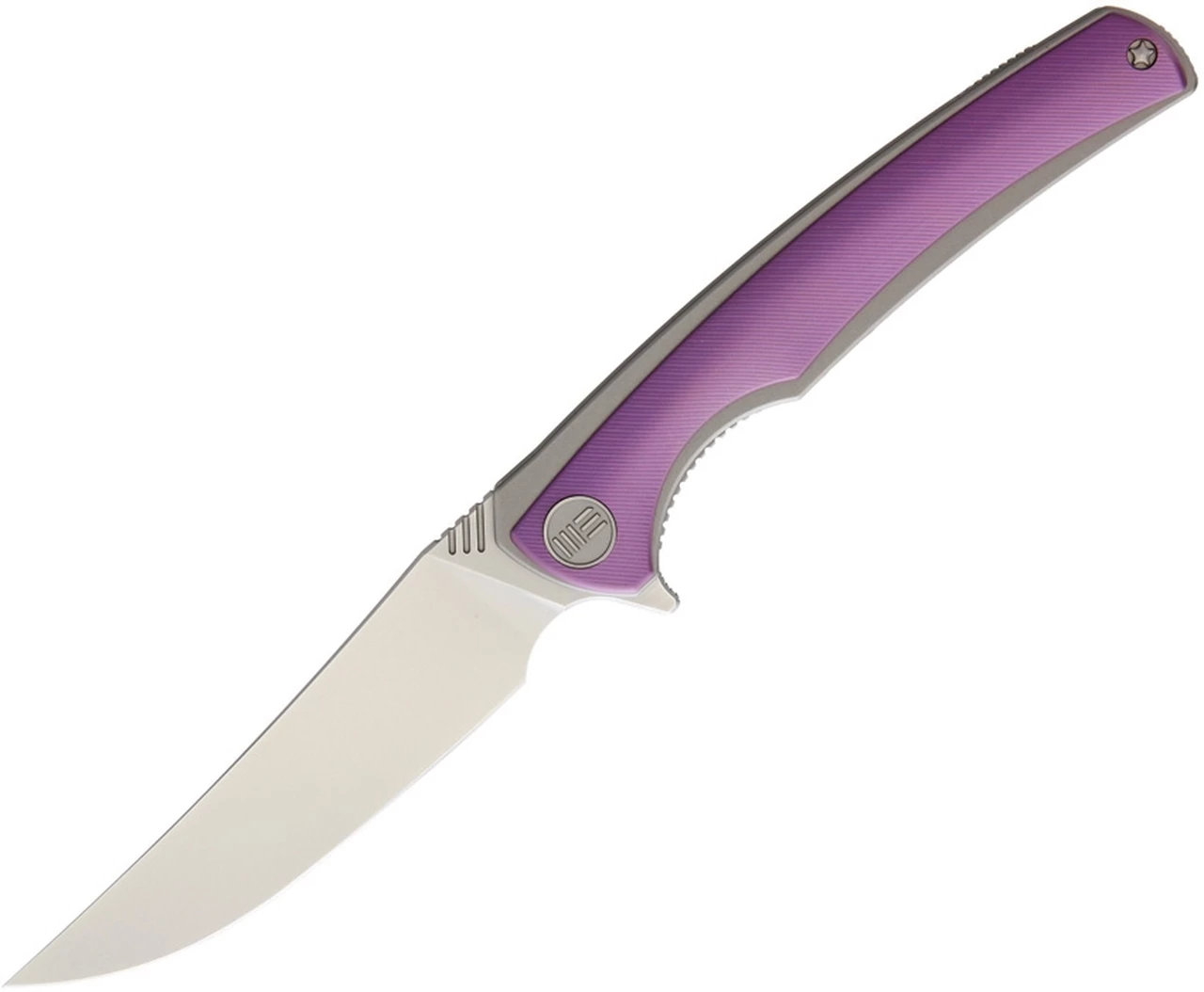 We Knife Model 704 Linerlock Folder 704A, 3.6” Bohler M390 Satin Trailing Point Plain Blade, Purple Anodized Textured Titanium Over Titanium Handle