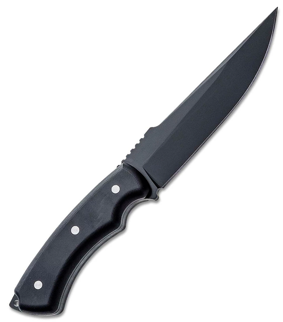 - Black finished 8Cr13MoV trailing point blade.
