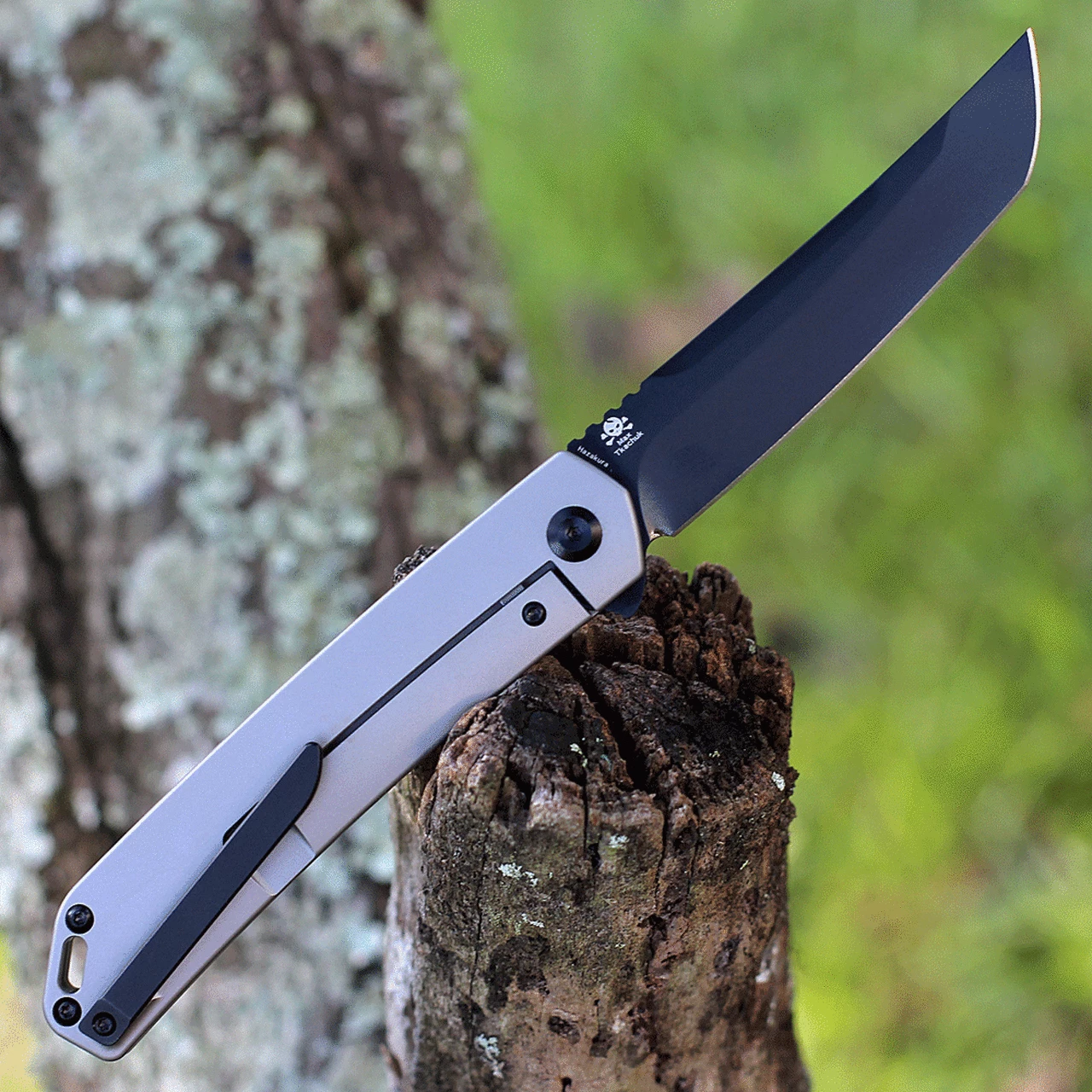 This Kansept HazaKura is made with S35VN stainless steel blade and a gray titanium and carbonf fiber handle.ย The hazakura features a 3.5″ black coated tanto blade with a flipper for easy opening and a frame lock.