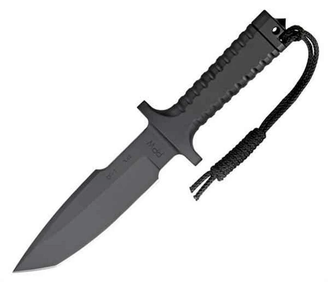 This integral knife is all Armor black CeraKote finish with a fluted handle for no slip grip and a drop point blade with a false top edge. Makers mark and serial number stamped on blade (serial number may differ from knife pictured). Includes original box and paperwork with a letter of authenticity and a “Spec Ops Combat Master” nylon sheath. These knives are some of the first 45 made in this production and have a case hardened butt cap with a conical glass breaker. This is an upgrade for any knife made after the first 45. Brand new from maker.