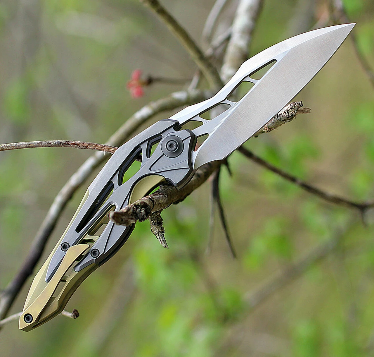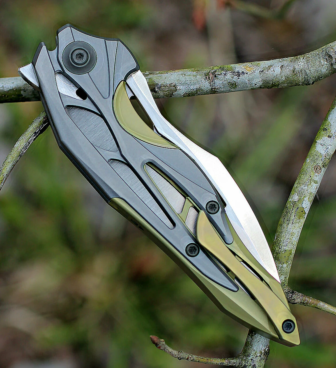 WE Knife 906C Arrakis, 3.45″ M390 Plain Wharncliffe Blade, Gold/Grey Titanium Handle
